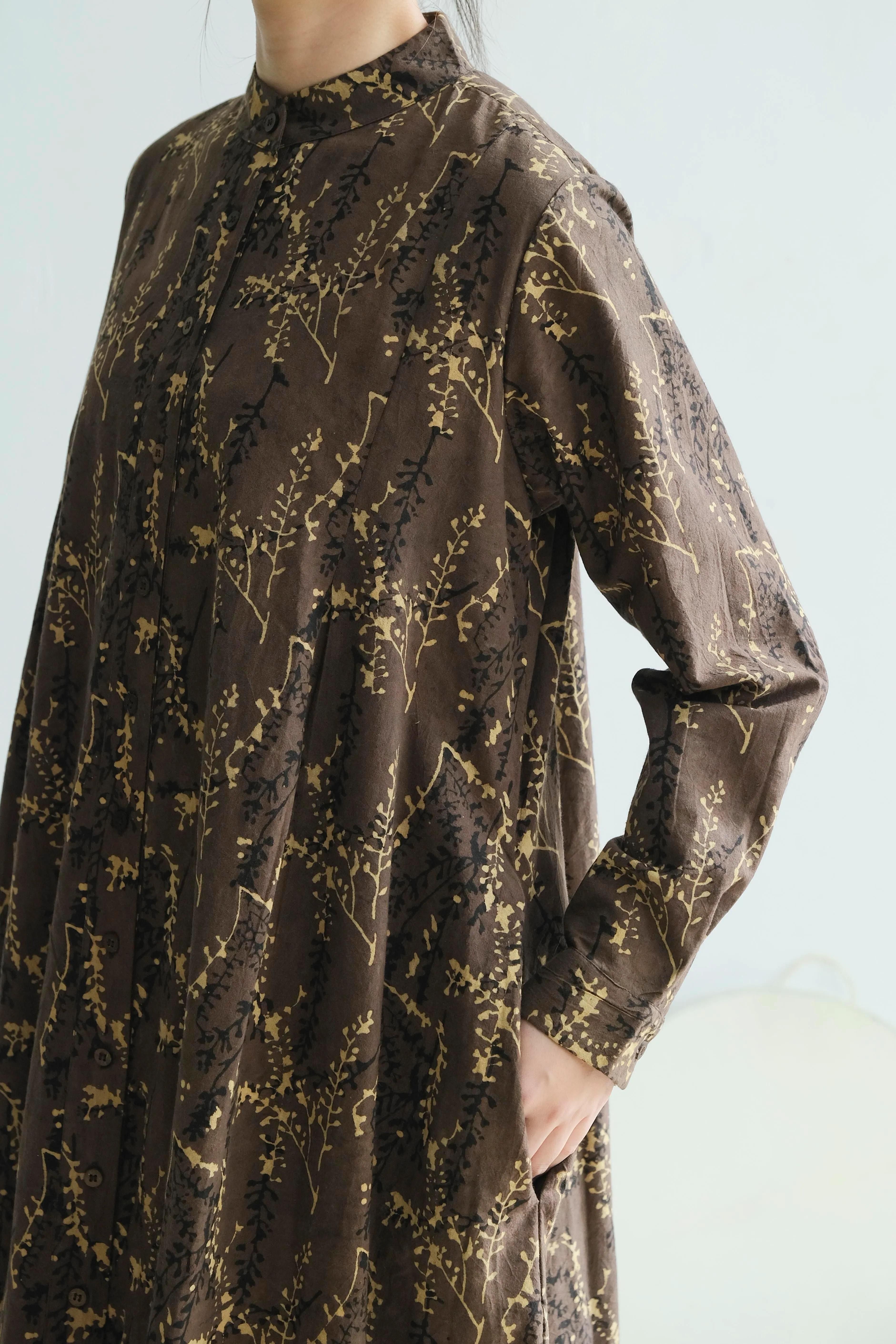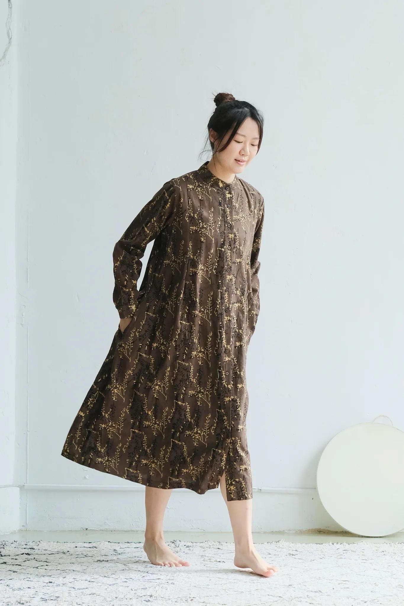 アートな泥防染プリントが魅力的な、機械生地のフロントクロスワンピース。インド製の上質コットン100%、肩幅50cm、身幅52cm、着丈119cm、袖長29cm、裄丈55cm。心地良い着心地で、月花草-seed-にインスピレーションを受けたデザイン。