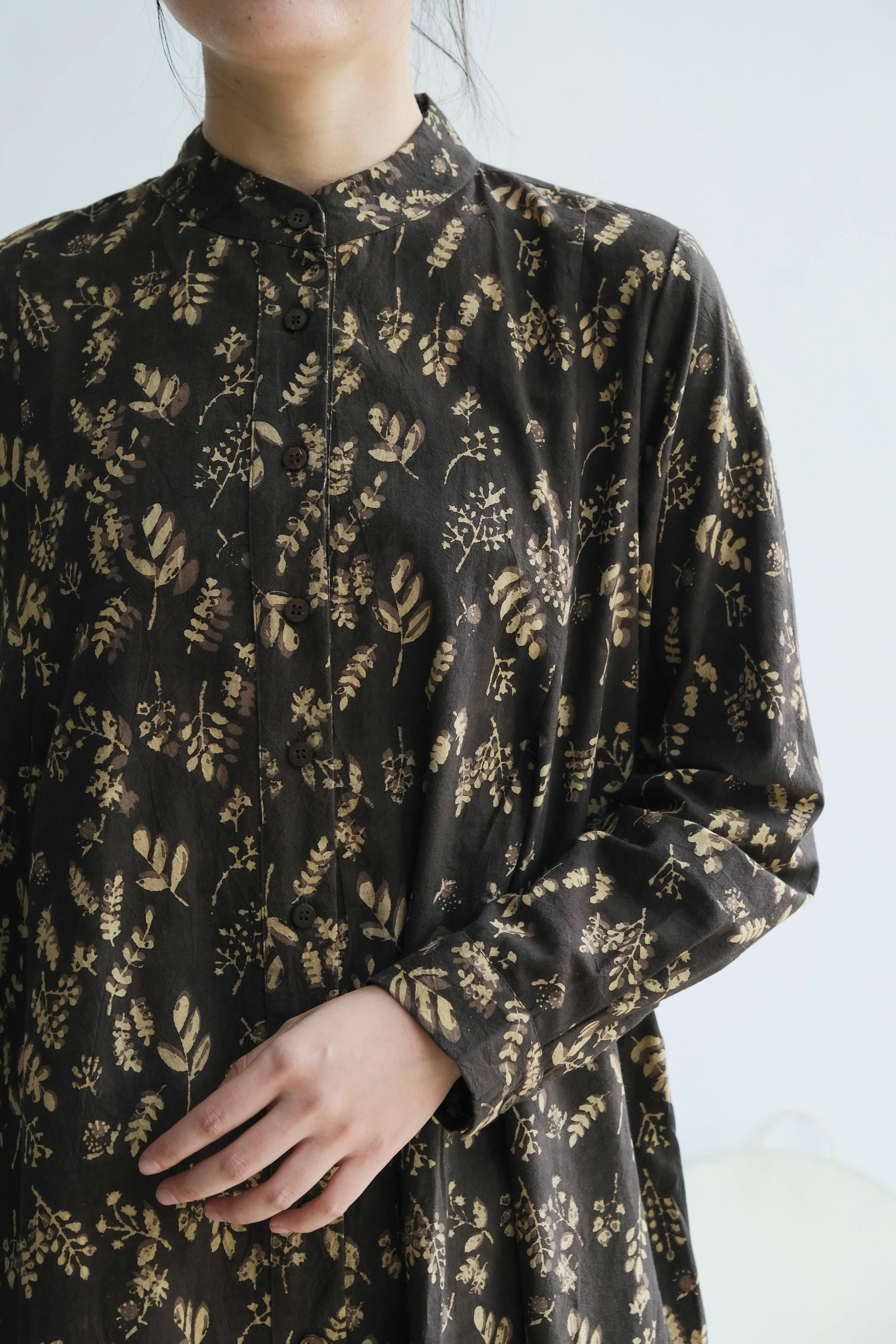 シャツワンピース bloom。上半身すっきり、下半身広がり、着まわし力抜群。暖かい日はワンピース、寒い日はレイヤードスタイルで。手染め製品、個々に違いあり。