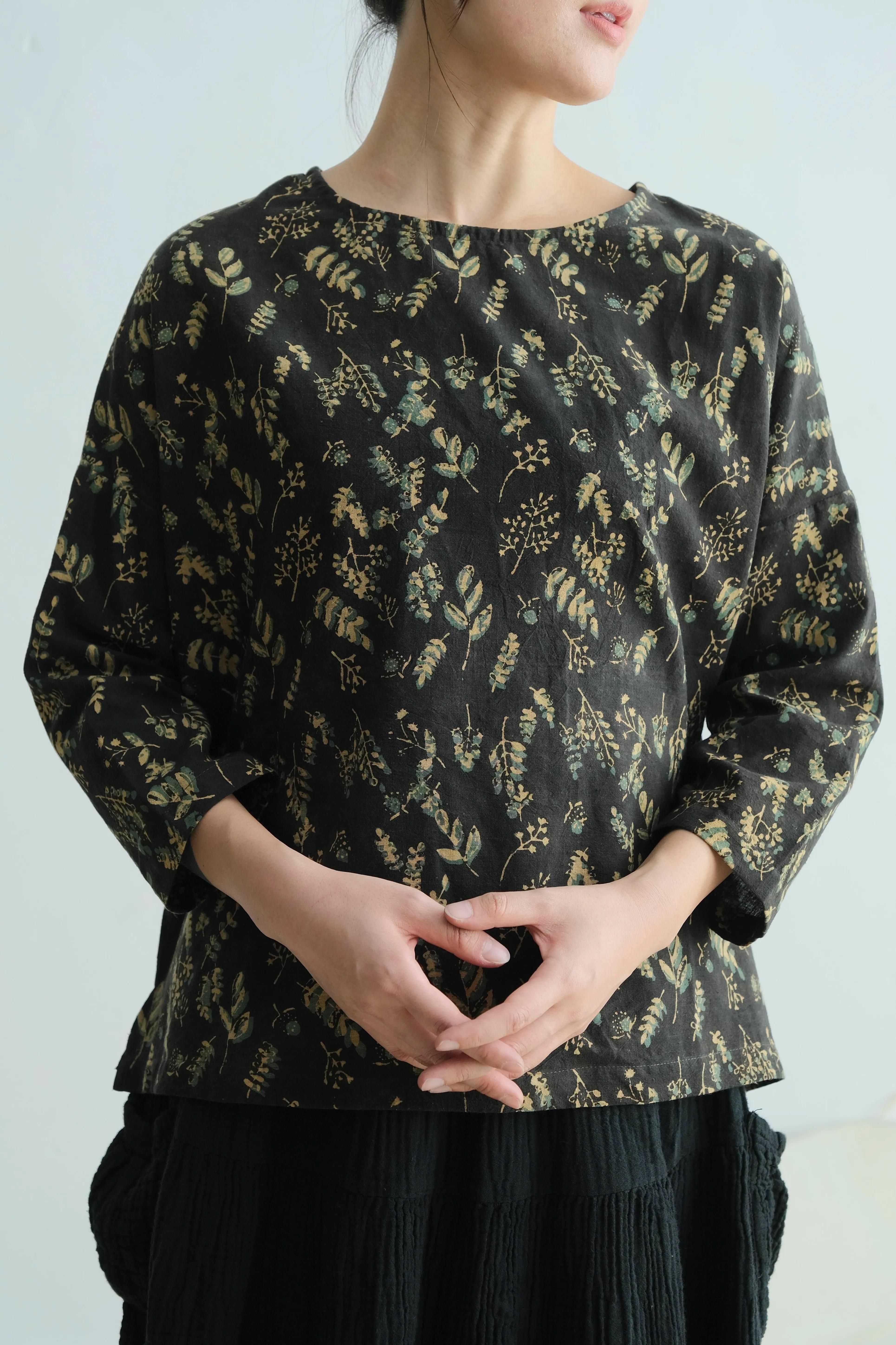 上品なプリントシャツ。ユニセックスで着回ししやすく、肌触りの良いコットン素材。40×40のシーチング生地を使用し、日よけとしても活躍。手織り生地で職人が手染め。PreferredSize.