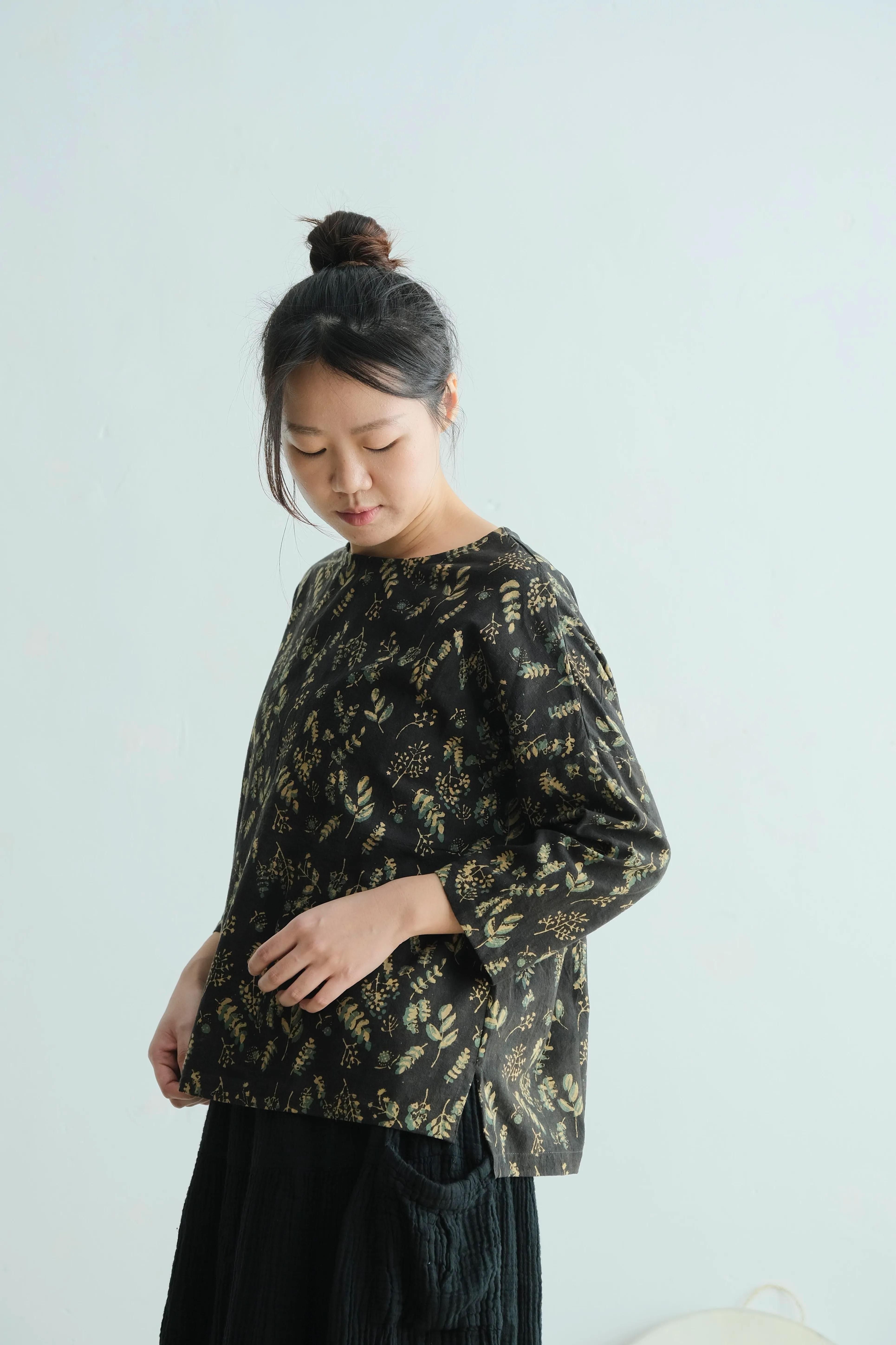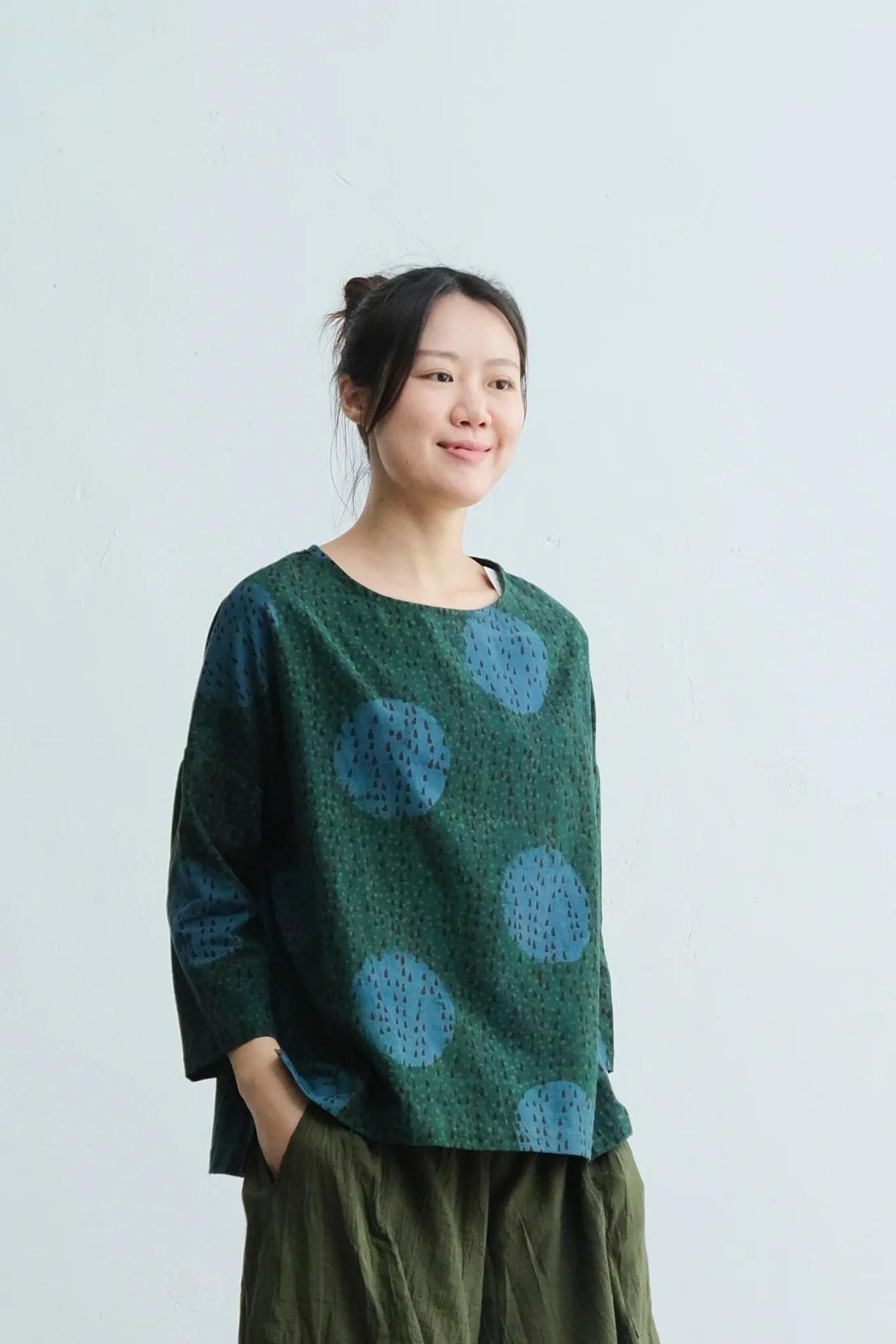 春を待ちわびる喜びを表現したkhadi ラウンドネックトップス。カディ生地と特徴的なデザインが暖かく、一点一点手染めされた個性豊かな一着。