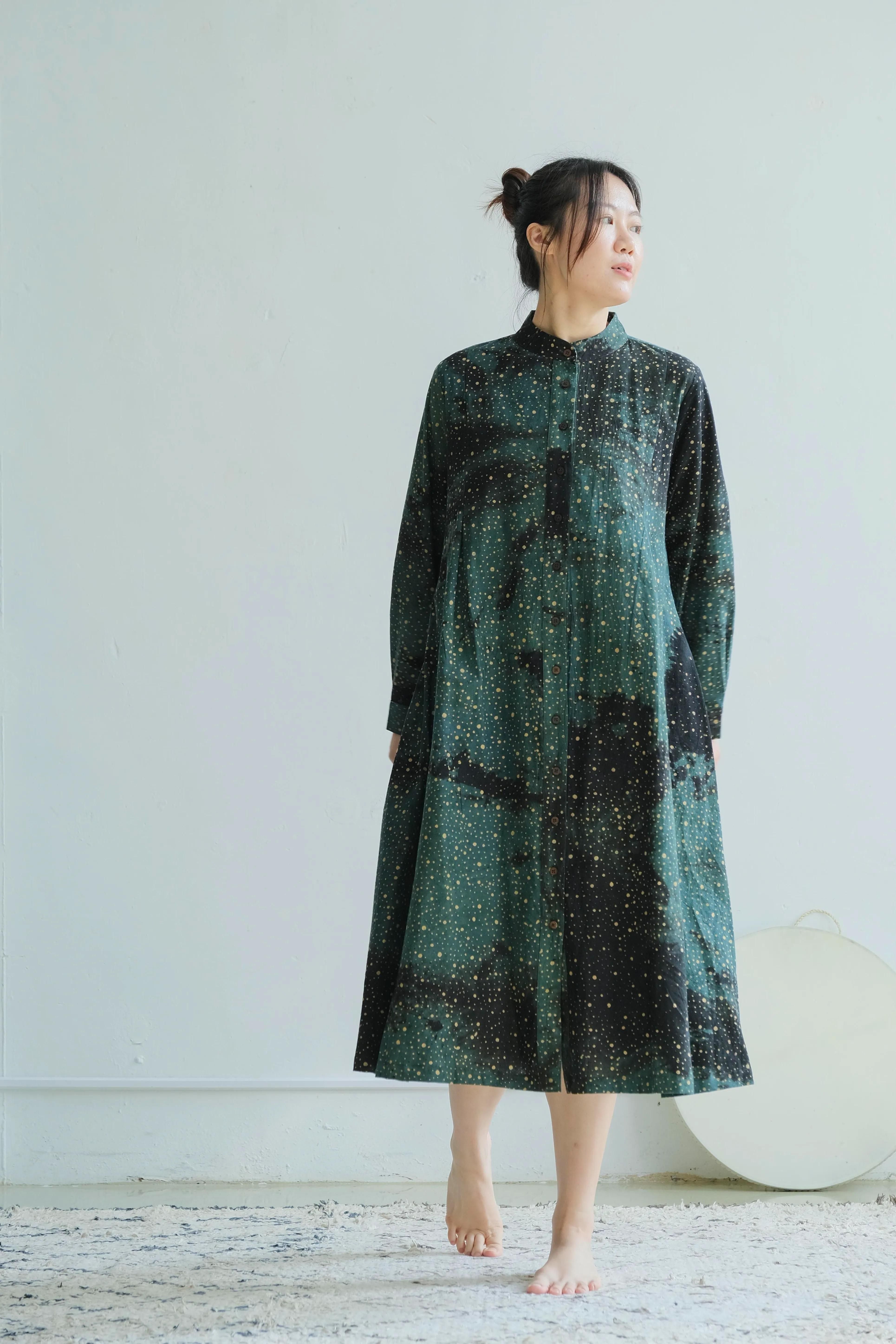 シャツワンピース B050 stardust green。ゆったりシルエット、コーデ自在。手染めダブプリント、コットン100%。身長169cmモデル着用。
