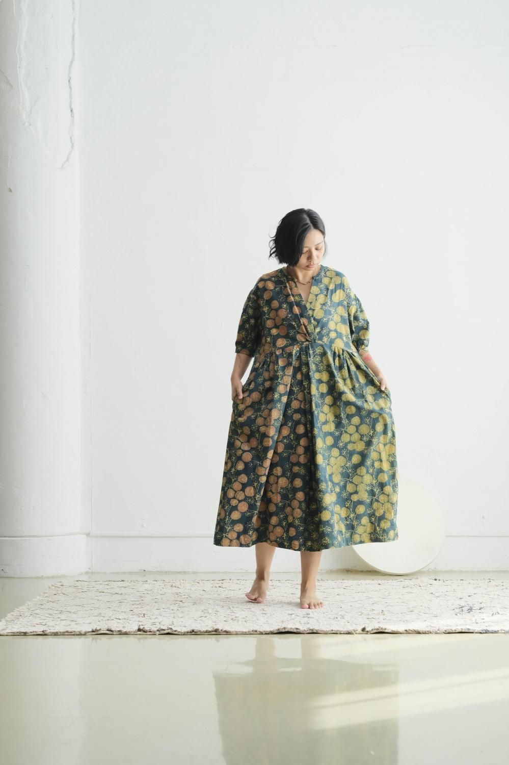 アートな泥防染プリントが魅力的な、機械生地のフロントクロスワンピース。インド製の上質コットン100%、肩幅50cm、身幅52cm、着丈119cm、袖長29cm、裄丈55cm。心地良い着心地で、月花草-seed-にインスピレーションを受けたデザイン。