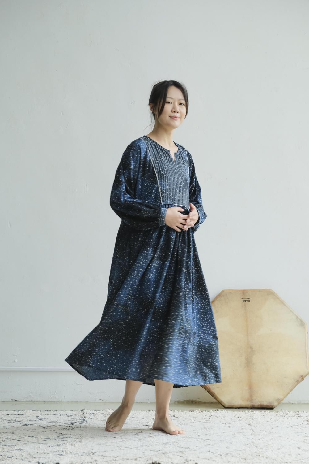 深いブルーに星屑を散りばめた、動くたびに揺れるシルエットが美しいヨークワンピース。ピンタックやゆったり袖が上品でリラックス感満点。洗練された秋冬スタイルを演出。